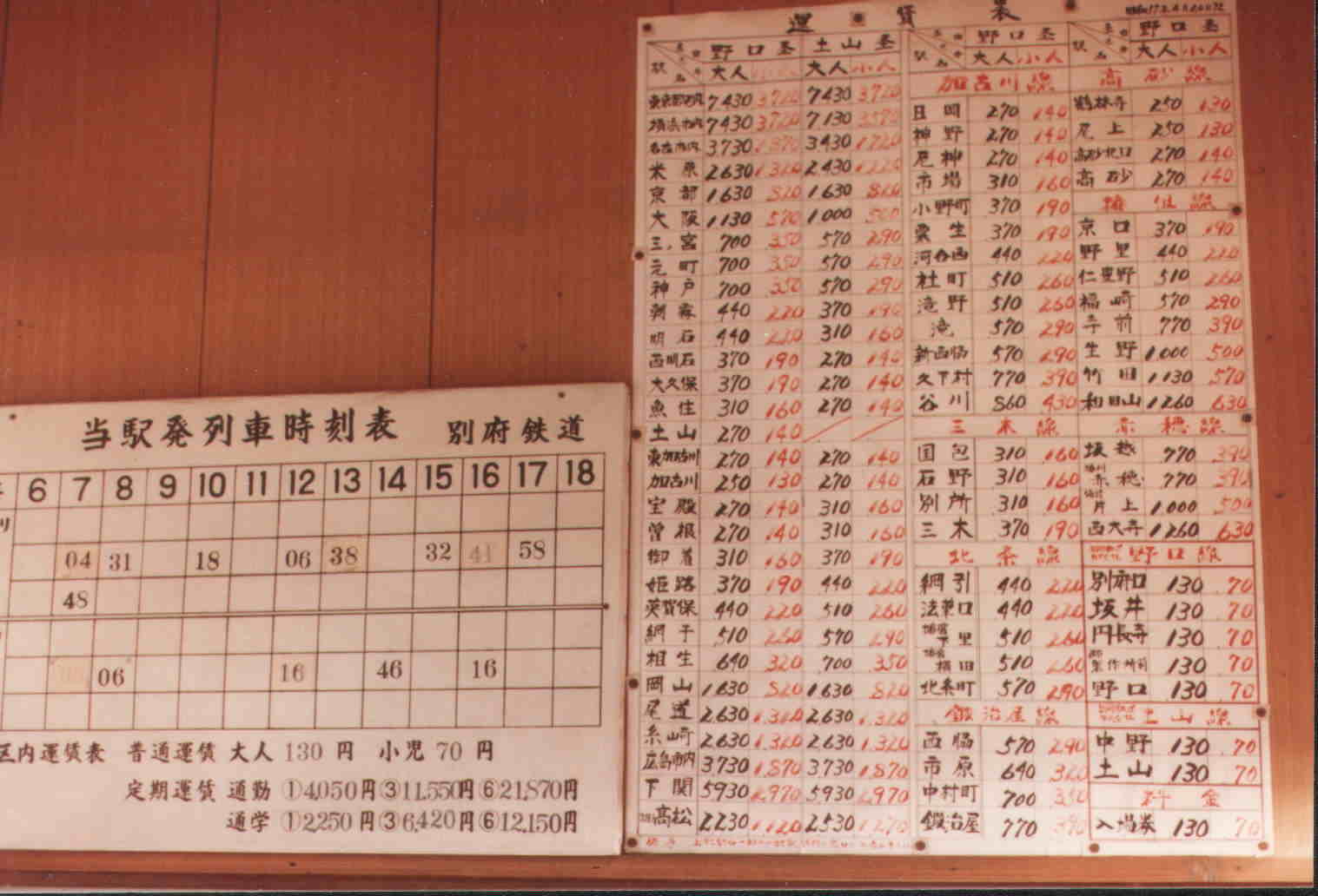 | 別府港駅から回送されるDD502 | 別府港駅舎に掲示されていた時刻表と運賃表 |