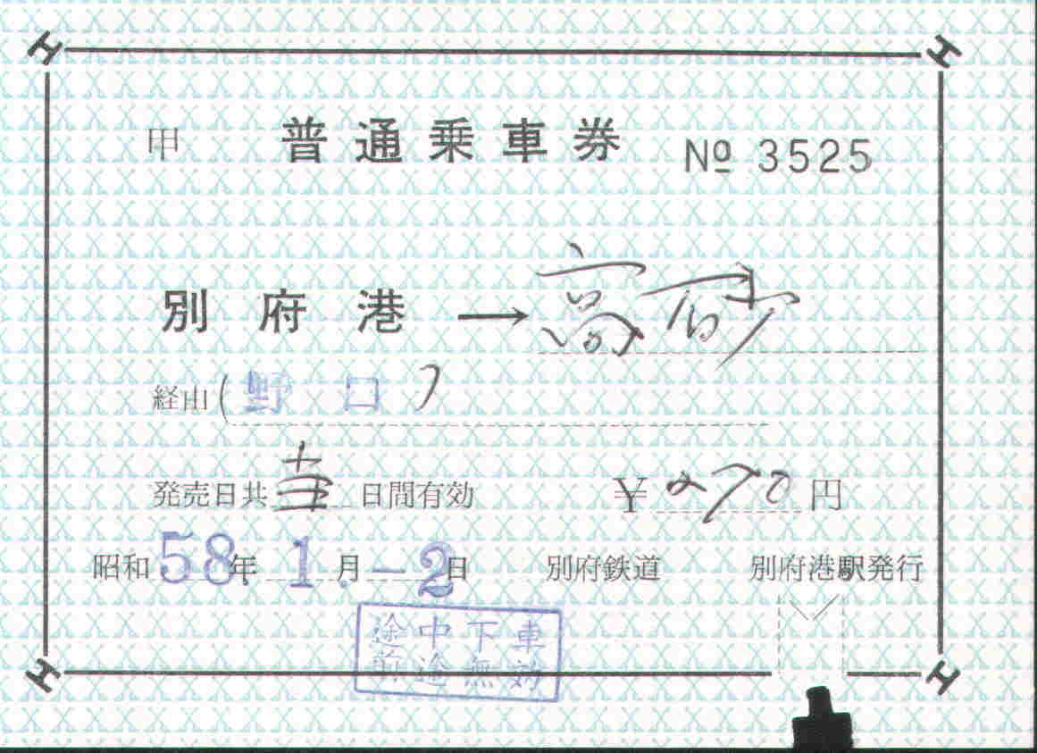 | 別府鉄道の乗車券(地の模様は多木化学のマーク) | 乗車券の裏面 |